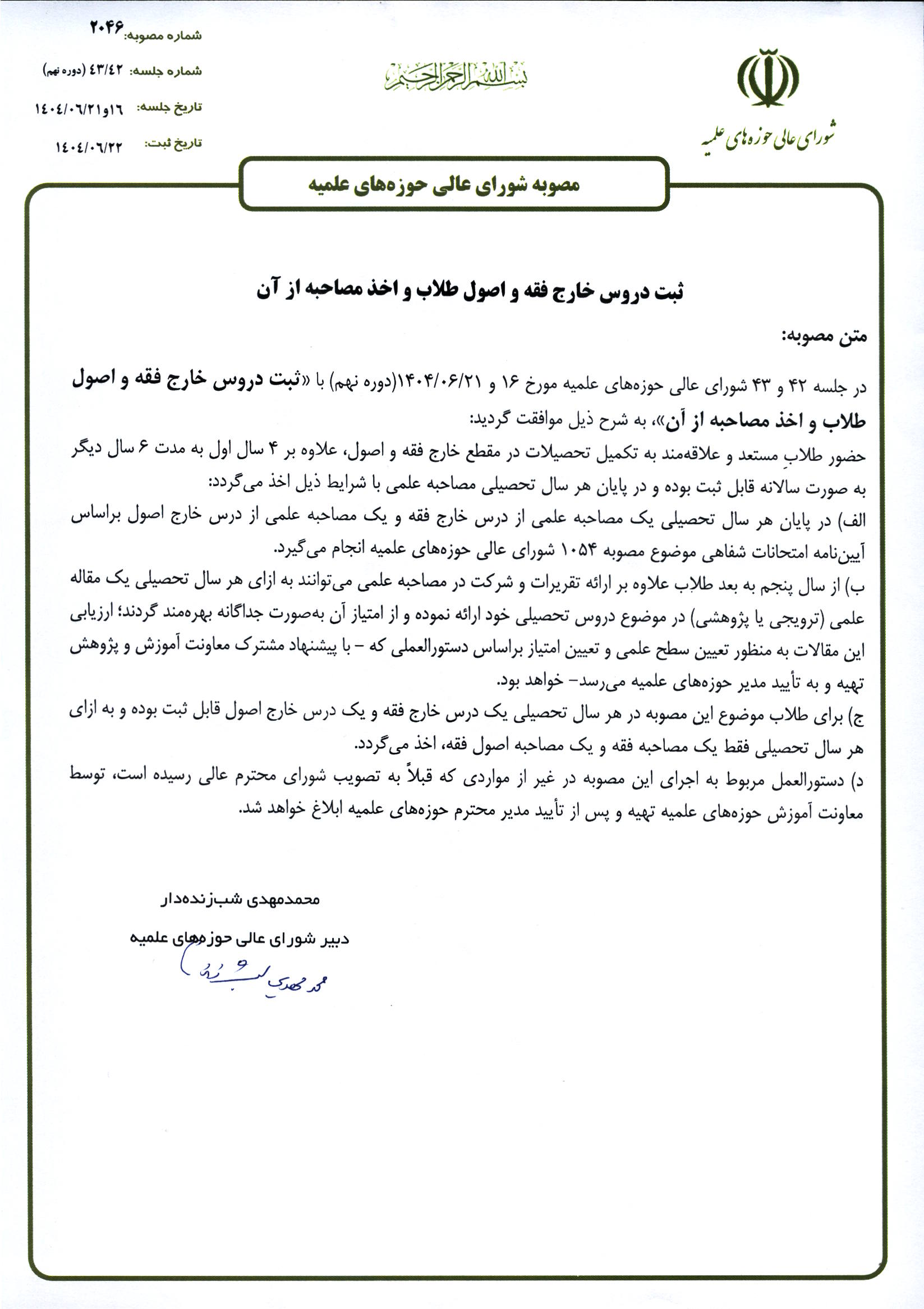 متن مصوبه:در جلسه ۴۲ و ۴۳ شورای عالی حوزههای علمیه مورخ ۱۶ و ۱۴۰۴/۰۶/۲۱(دوره نهم) با