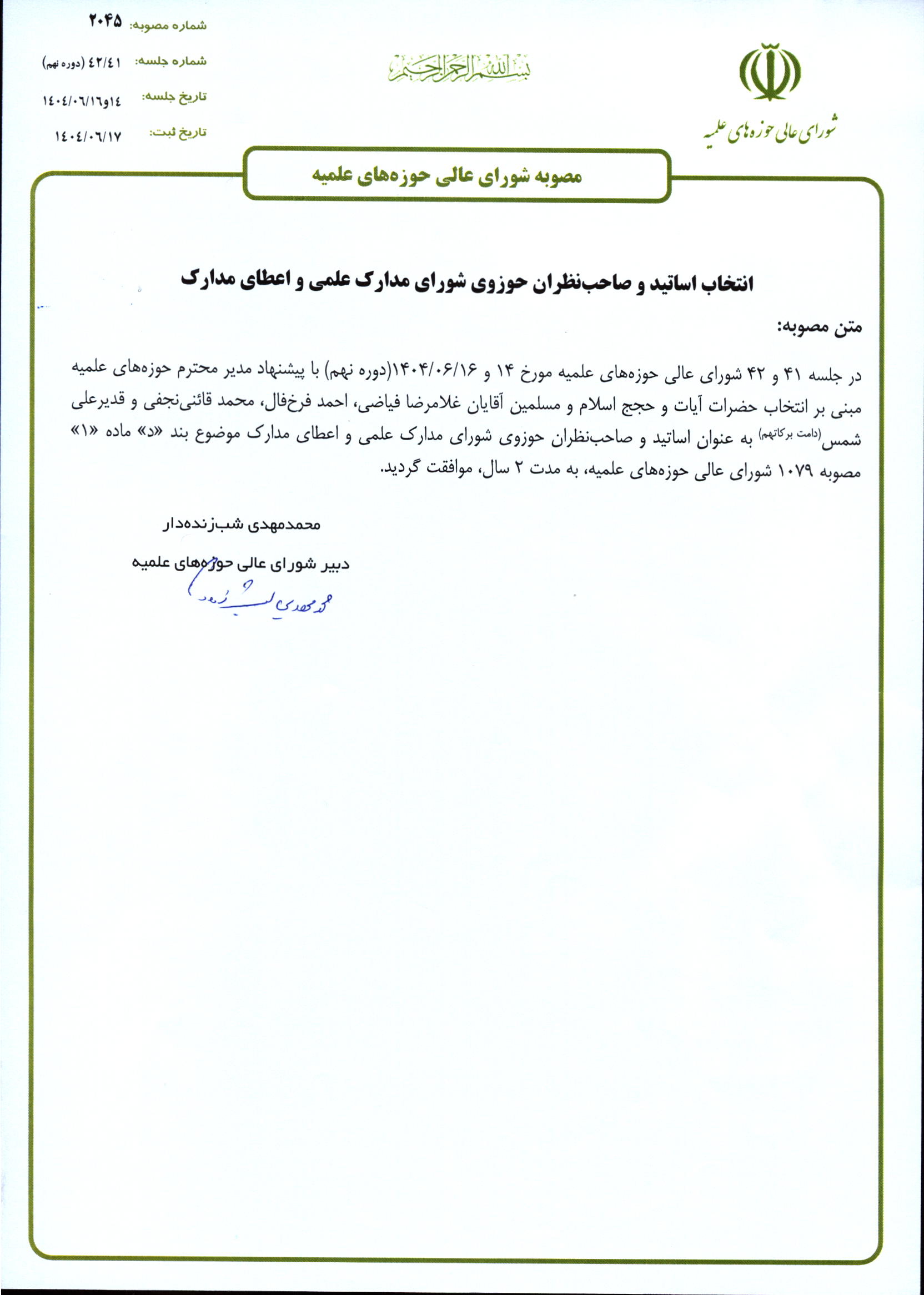 متن مصوبه:در جلسه ۴۱ و ۴۲ شورای عالی حوزههای علمیه مورخ ۱۴ و ۱۴۰۴/۰۶/۱۶(دوره نهم) با پیشنهاد مدیر محترم حوزههای علمیه مبنی بر انتخاب حضرات آیات و حجج اسلام و مسلمین آقایان غلامرضا فیاضی، احمد فرخفال، محمد قائنینجفی و قدیرعلی شمس